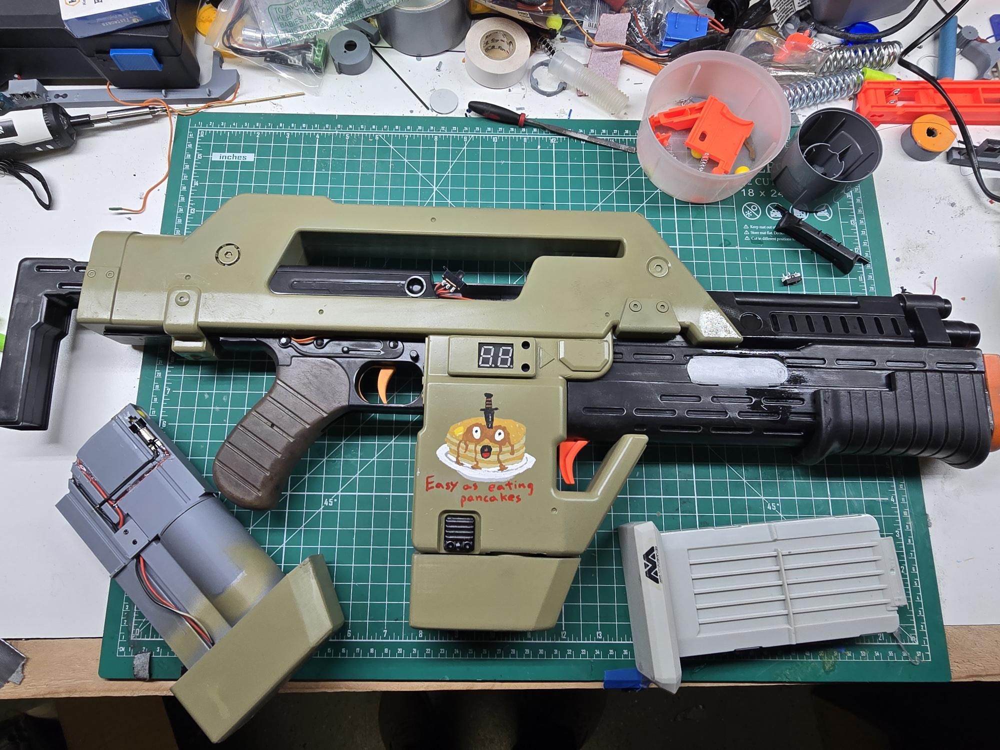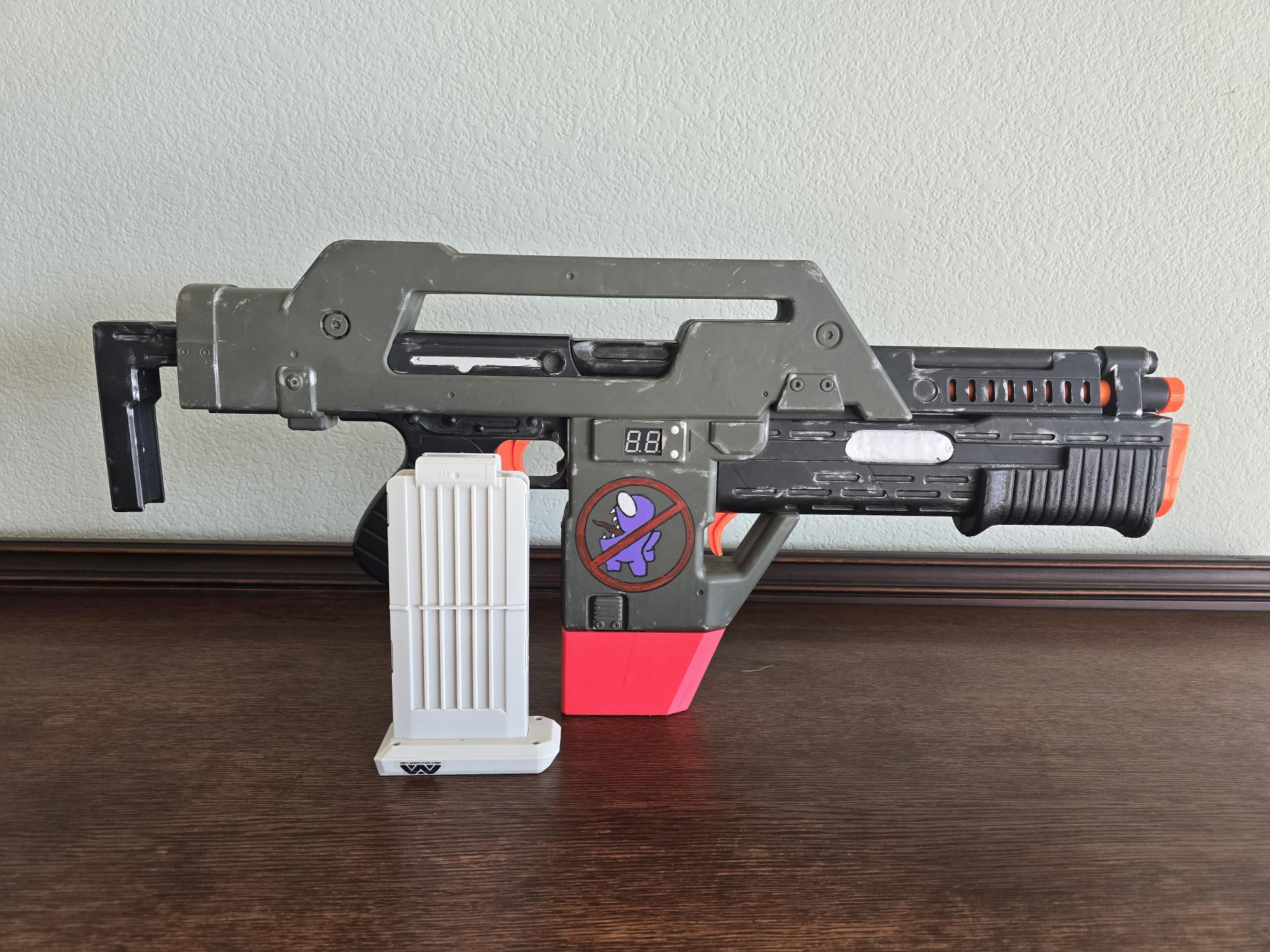 Wanted to share my upgraded my Nerf Pulse Rifle with a 60 round paintball style loader to push 50cal rounds, uses Monkey Mods 50cal foam balls for the primary. Modded the underslung launcher to a three round auto advancing grenade launcher capable of holding x1 standard nerf dart, x2 short darts, x1 short dart and x3 50cal balls, or x5 50cal balls.