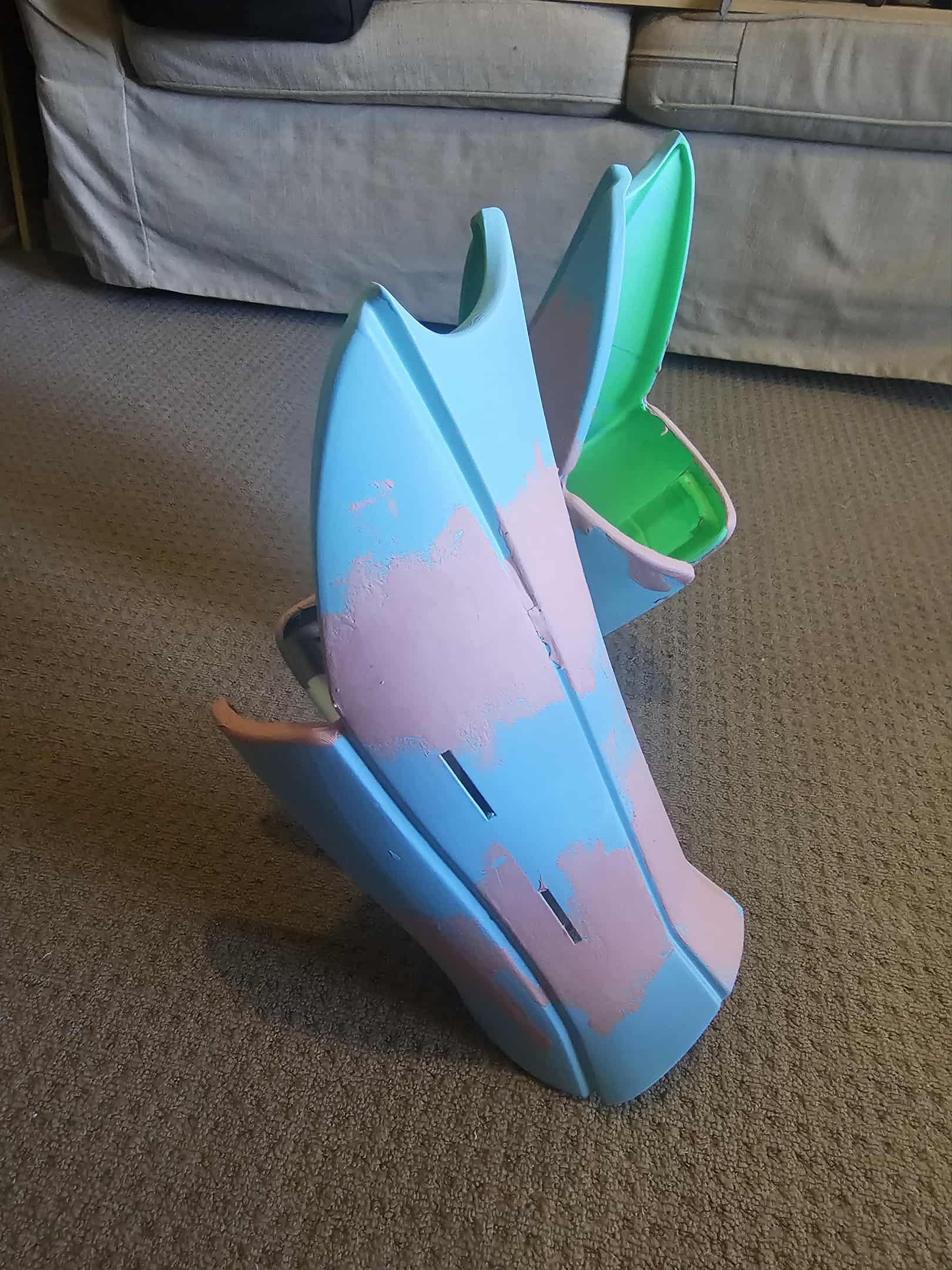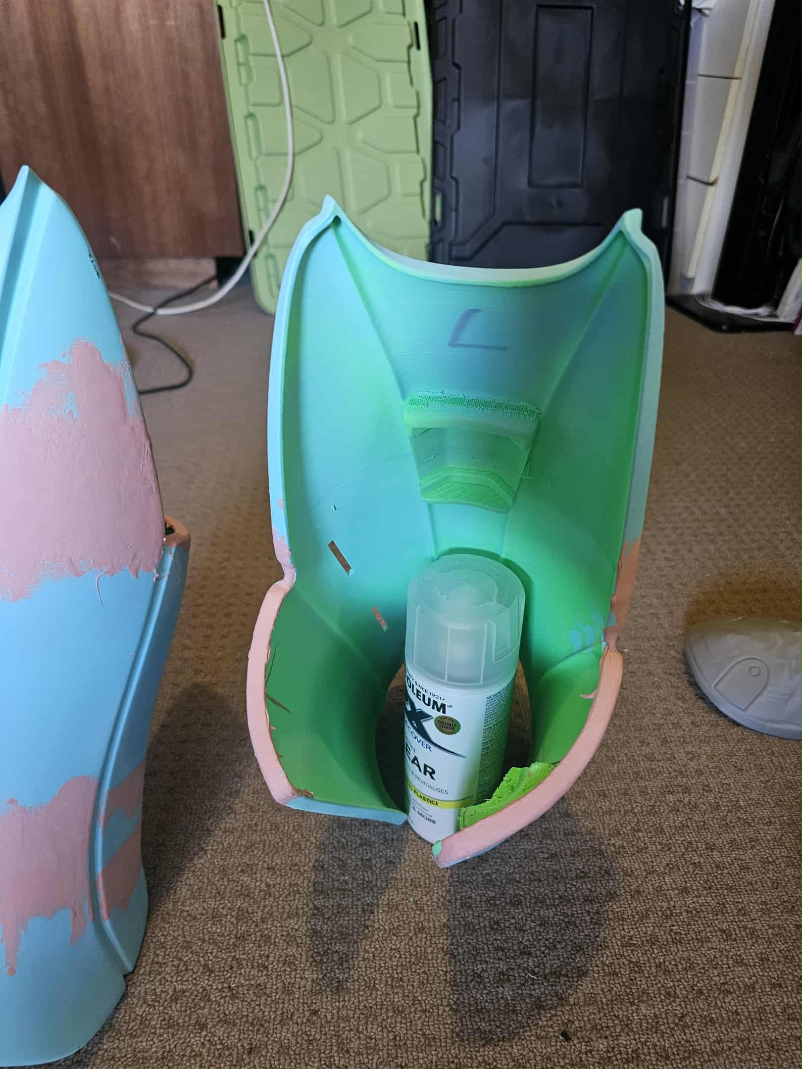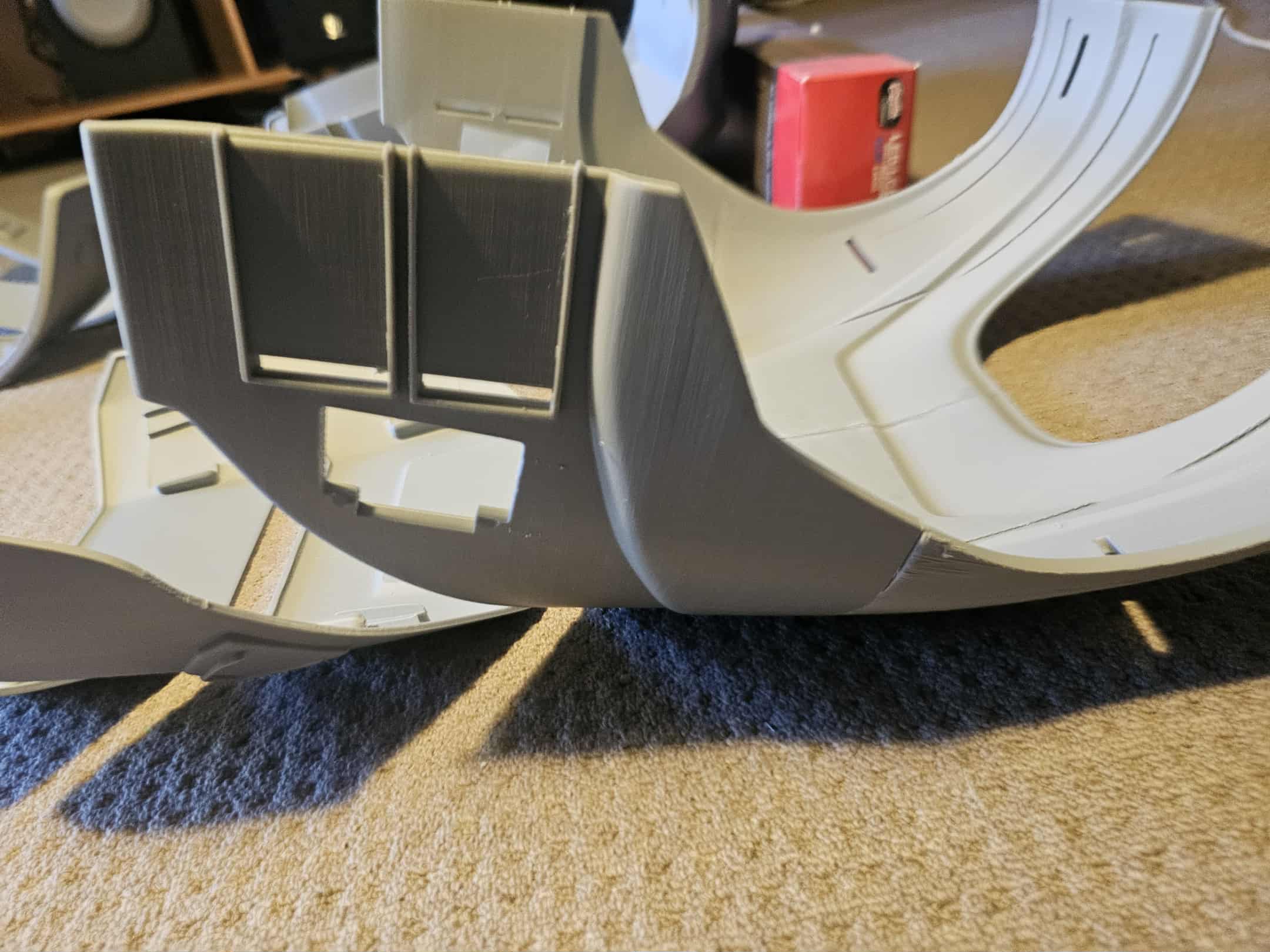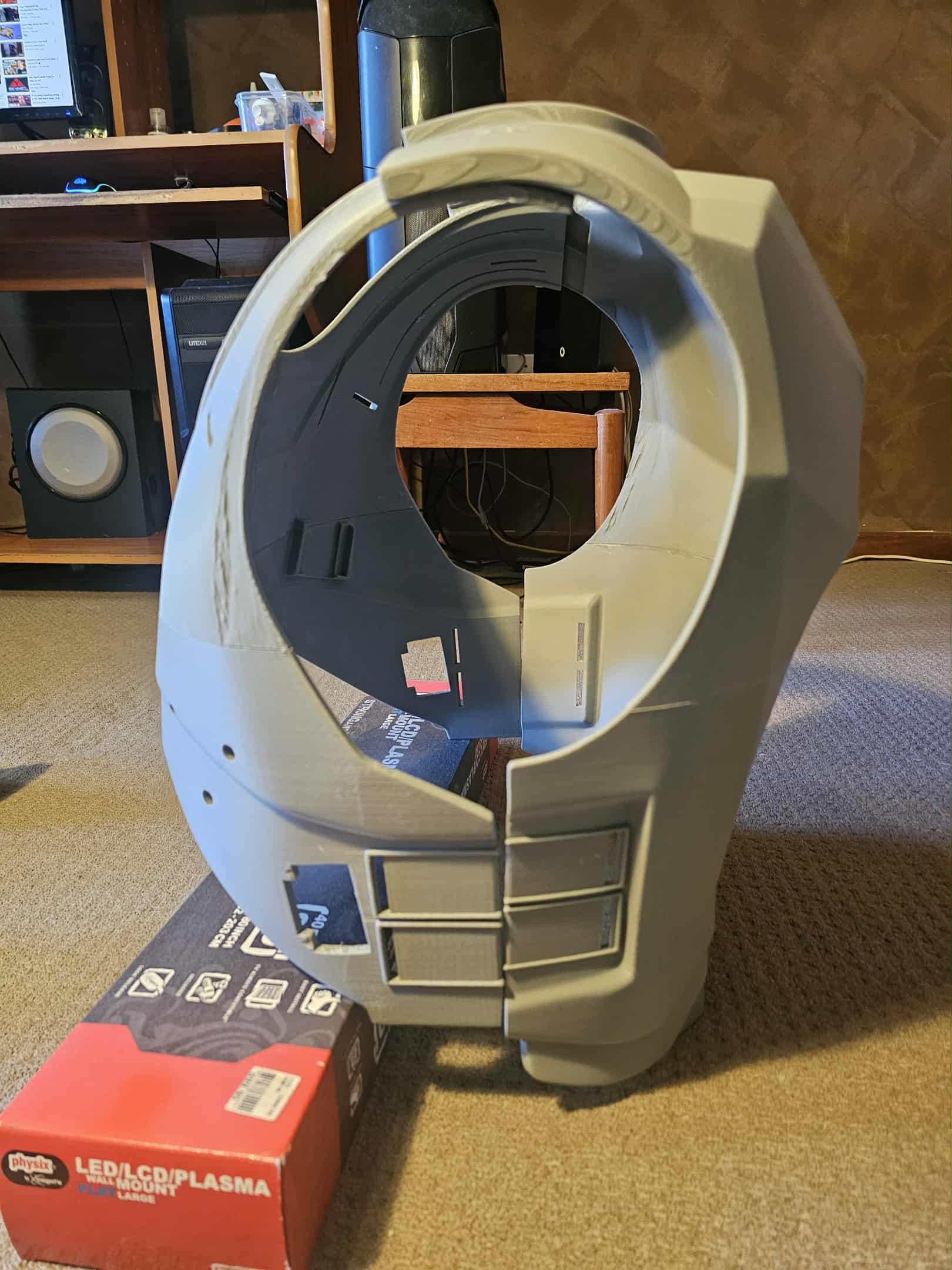 the shoulder lamp and greebles for the chest plate are still required prints. but the shoulder lamp is an extra that does not really need to be part of the final costume. in the coming months, bogging, sanding and final prep work will be done on the masters, then molding will begin. i will probably also sharpen the edging on the chest and abs V lines, re twirk the bicep guard to be a bit sharper at the base, ( bicep and Knees will be polyurethane rubber. and each piece of the shoulder sections on the chest and back plate will be cut to wearers specs, with piano hinges attached to create the clam shell effect while keeping the joins flush.