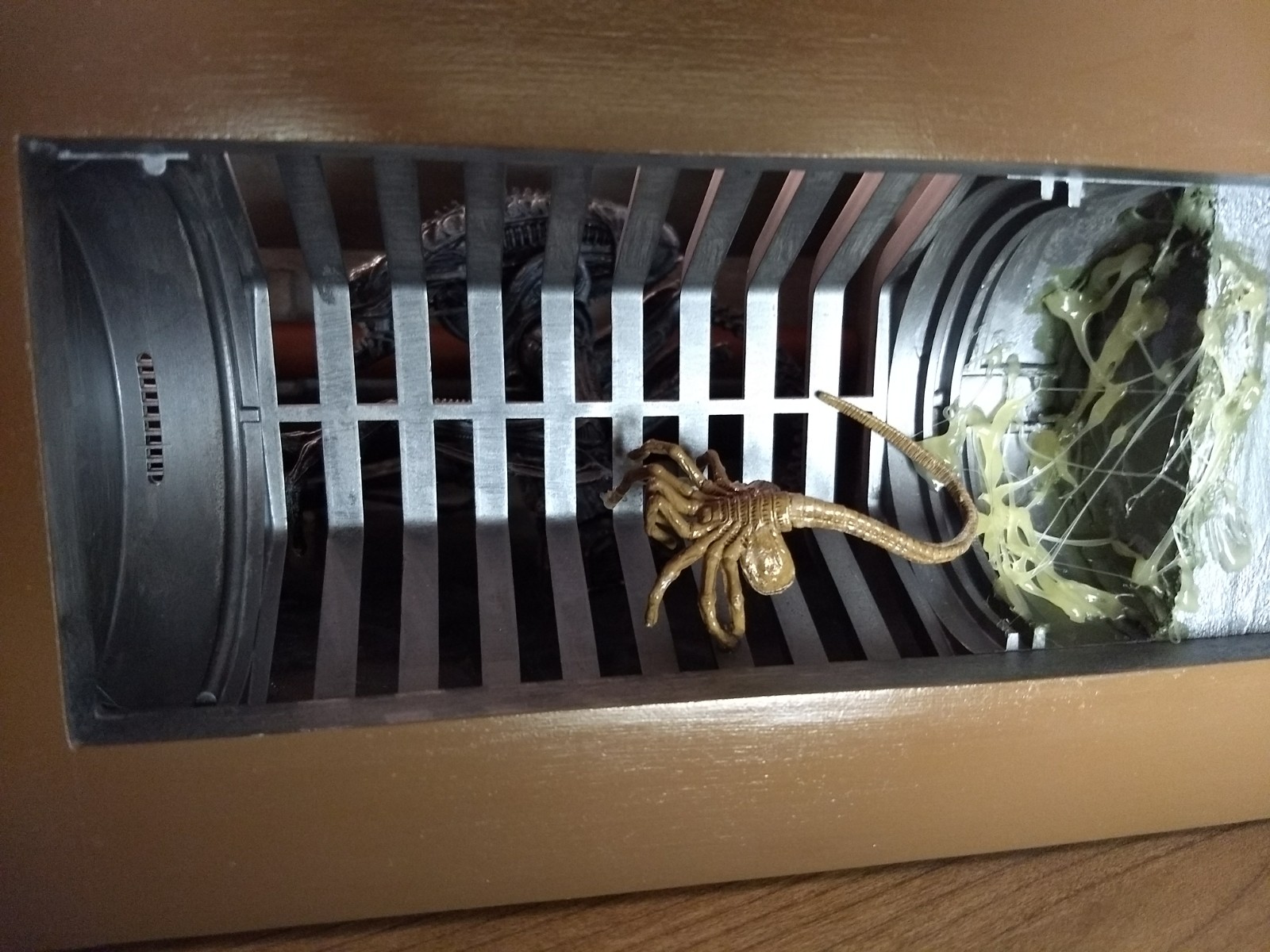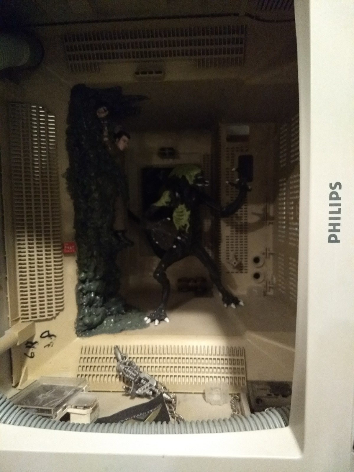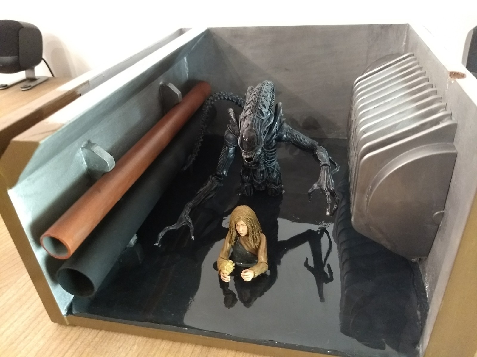 Here is a diorama I´ve made from wood, the albino alien (repaint) and plastic river drops. The top grates are from an old vcr.