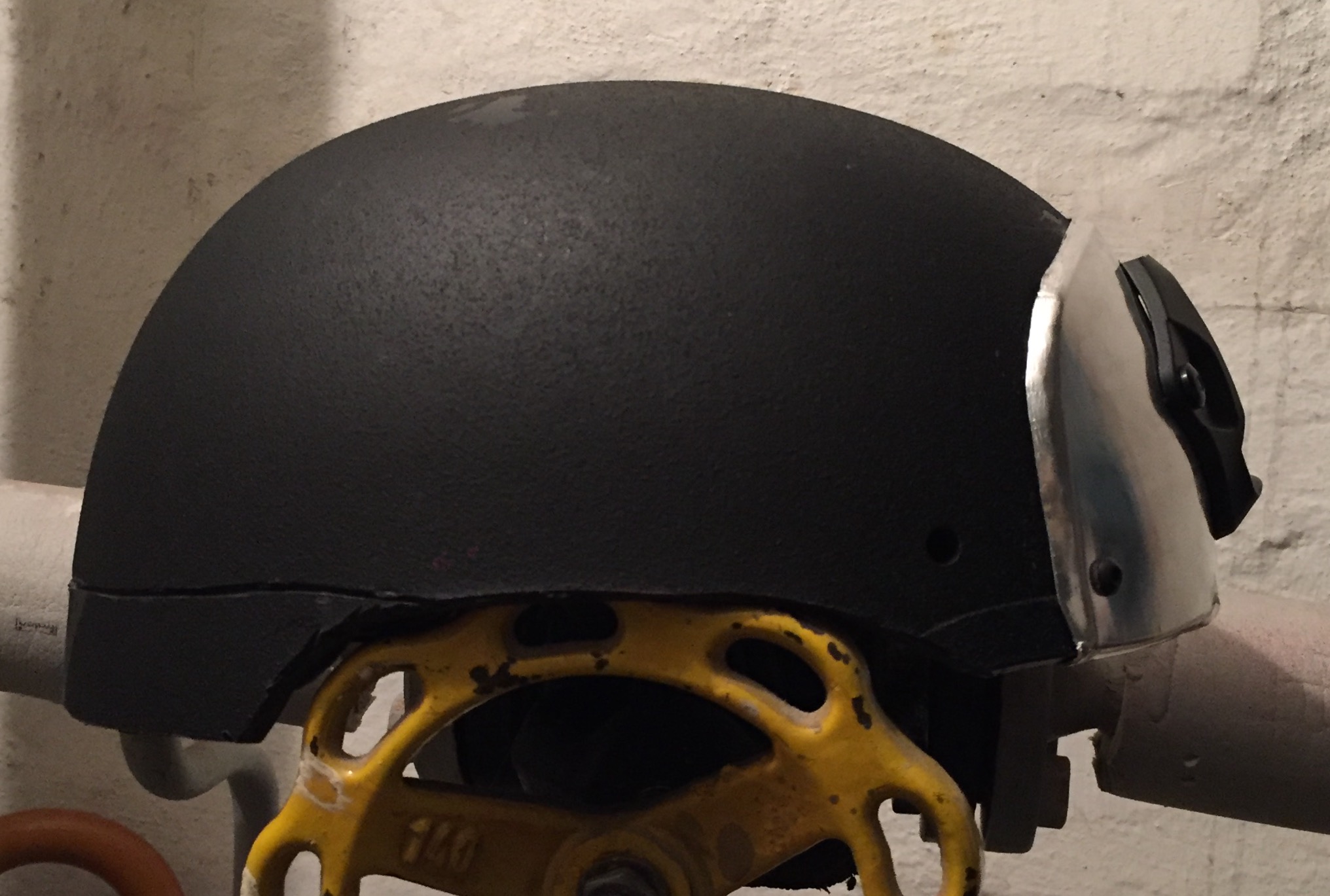 I got Started on the helmet,I started with a MICH 2002 airsoft helmet,I cut down the back and sides to akomidate for the rail that will go around the helmet and Koneckt at the front face plate.
