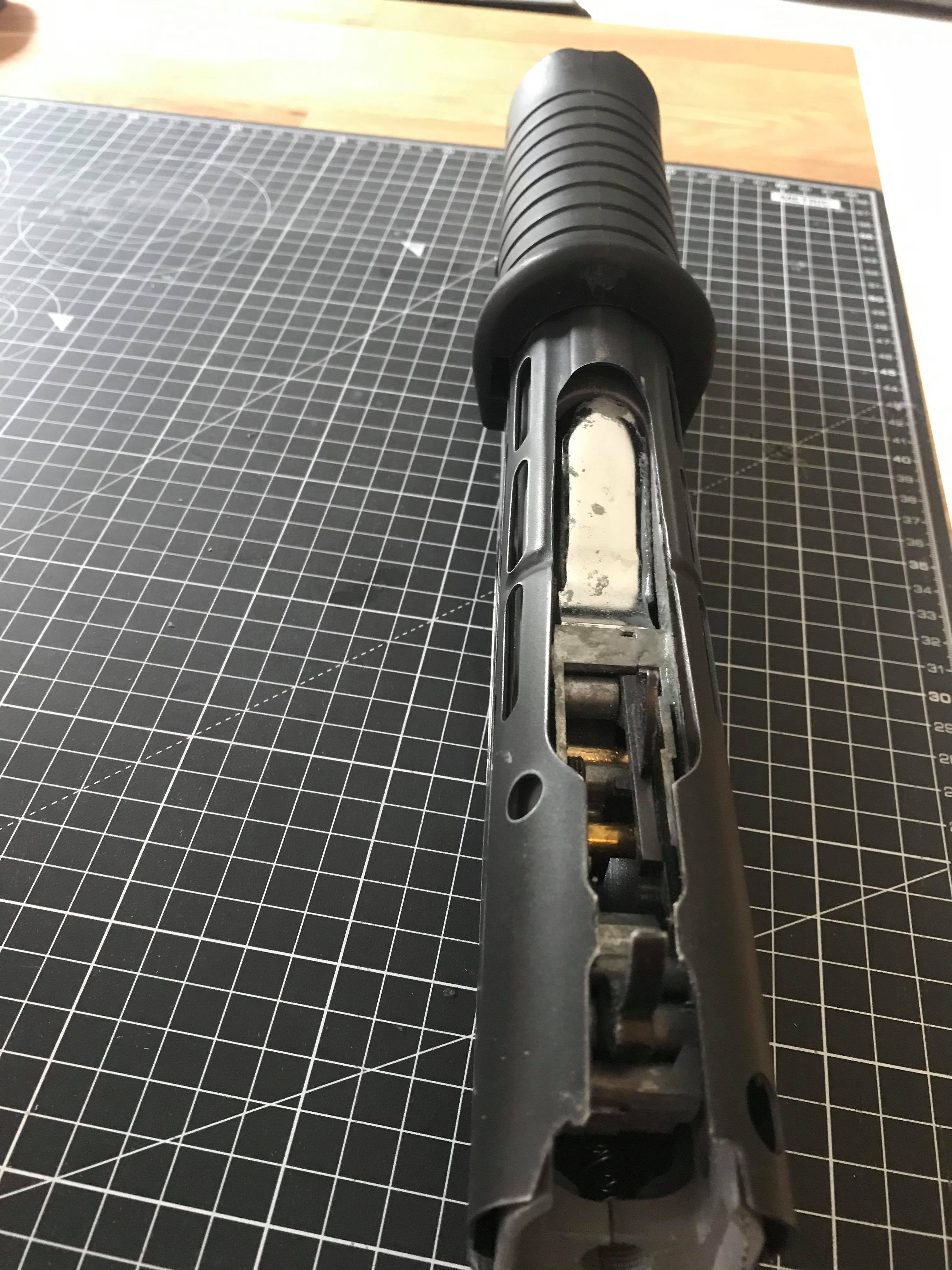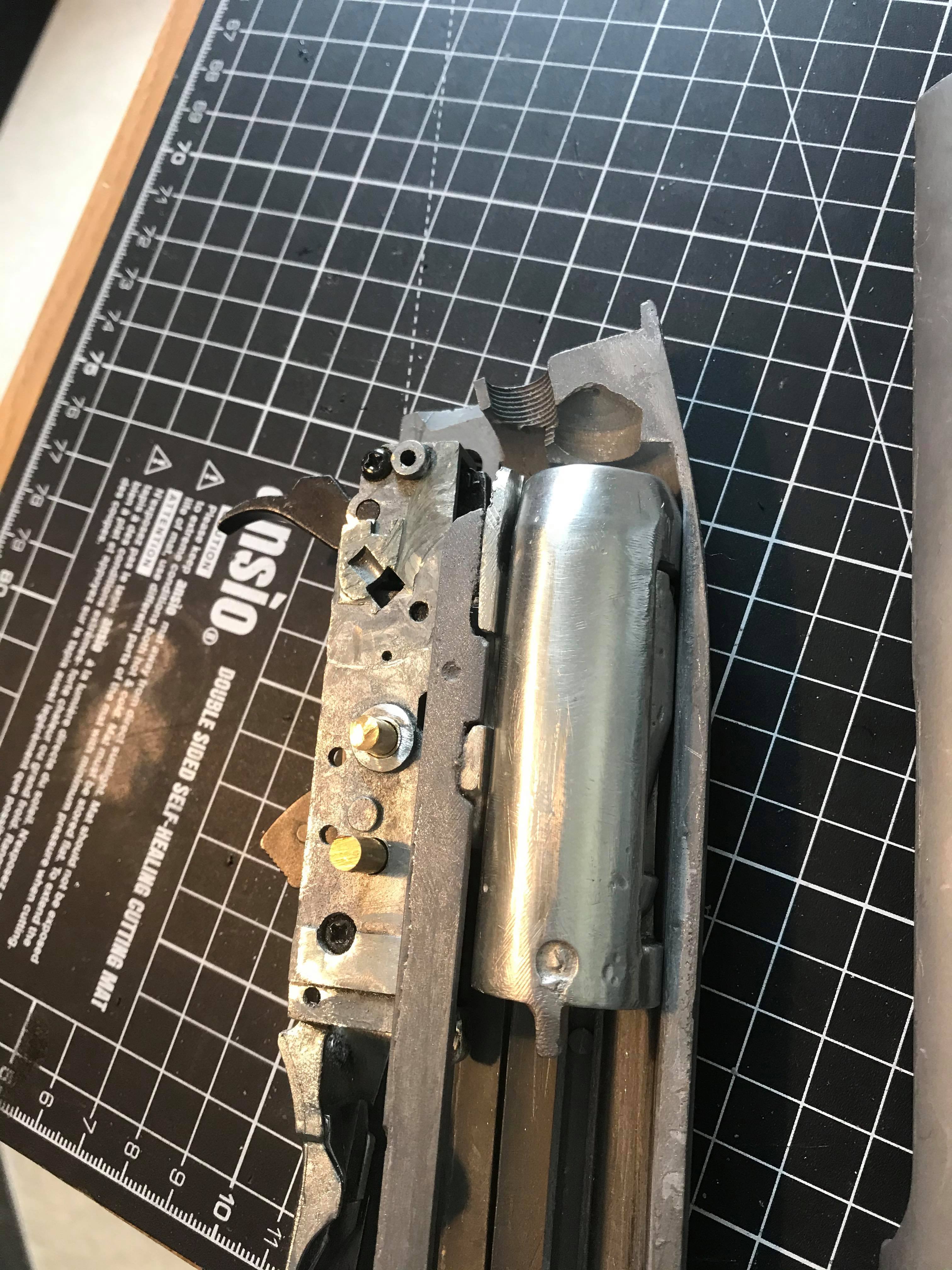 Shoehorned the Airsoft trigger assembly into a resin and pewter Remington receiver