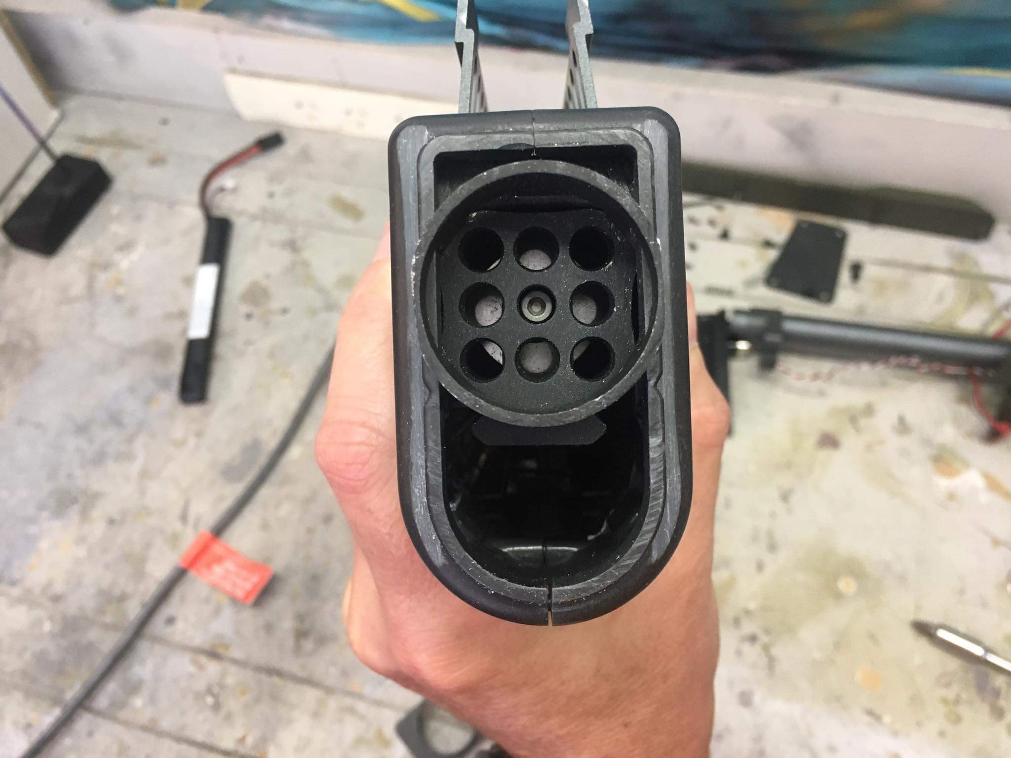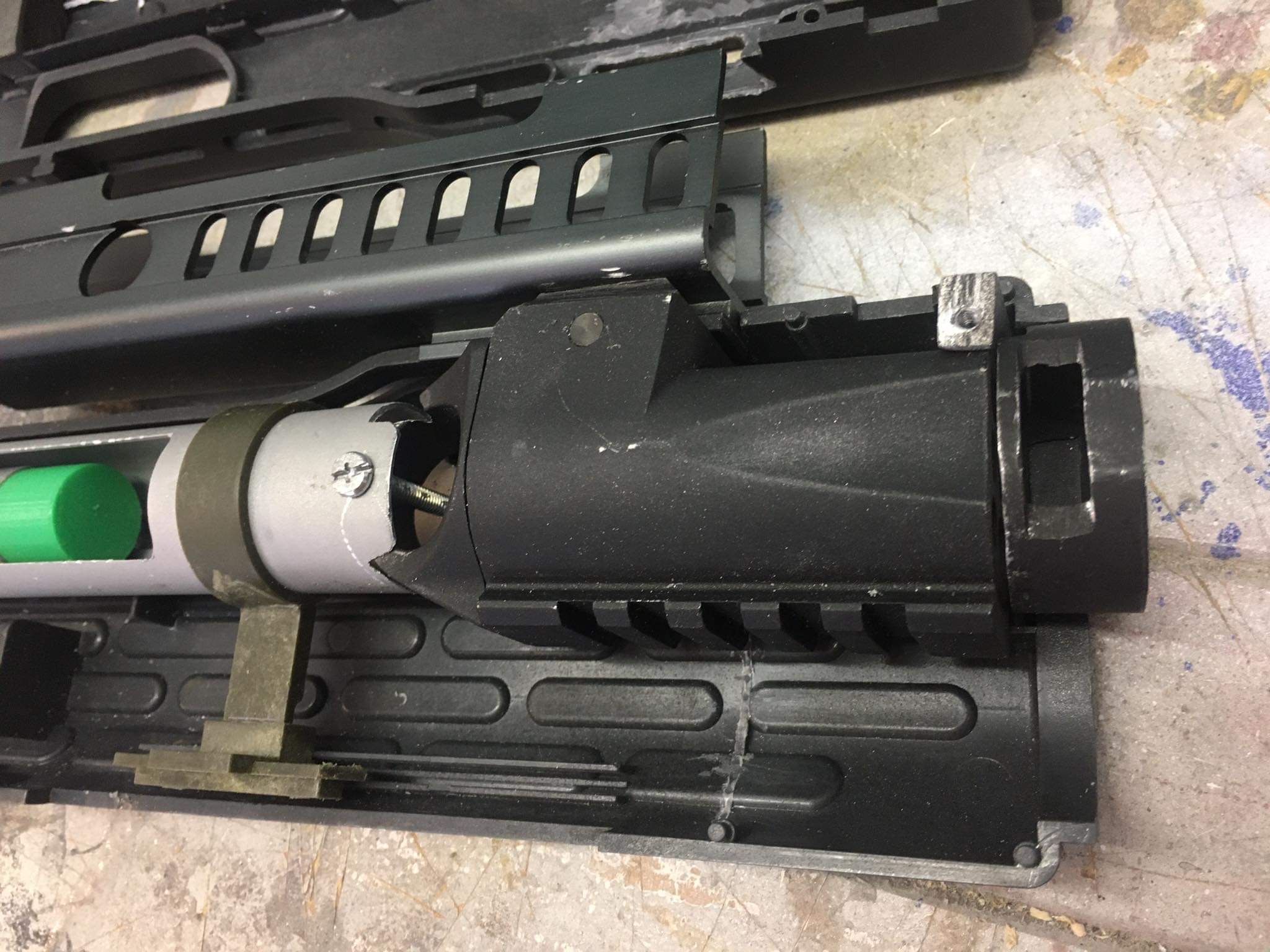 The modifications required fabricating aluminium parts to allow the launcher to mount to the underside of the barrel vent arrangement, a new aluminium ‘crossbar’ at the front and a 3D printed front cap with a wider barrel. A short aluminium barrel, and some modifications to the fake shotgun breech as well as careful modification of the spas cage itself.