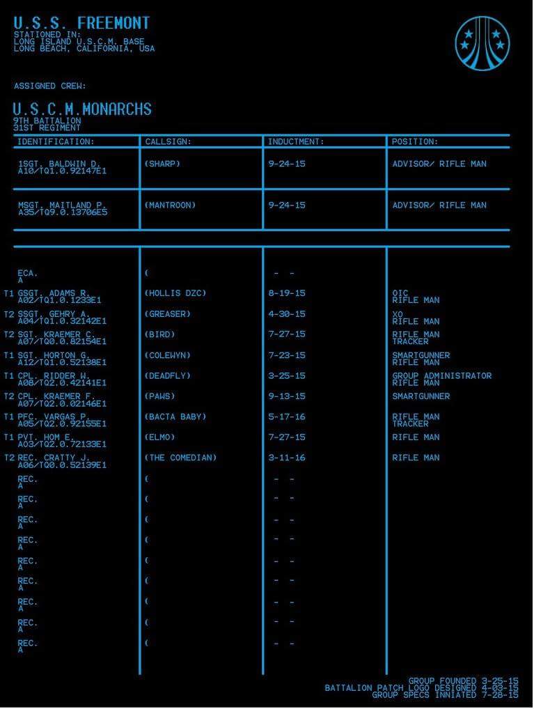 We are the 9th Battalion, 31st California Monarchs. We are assigned to the U.S.S Fremont.