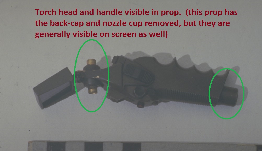 Which reminds me, I do believe they did have the torches hooked up 'live' in the cutting scenes. Notice how you never see the bottom (where the cables would be hanging from the handle) in those scenes. Also I noticed this pic the other day. His nozzle and back cap are backward!
