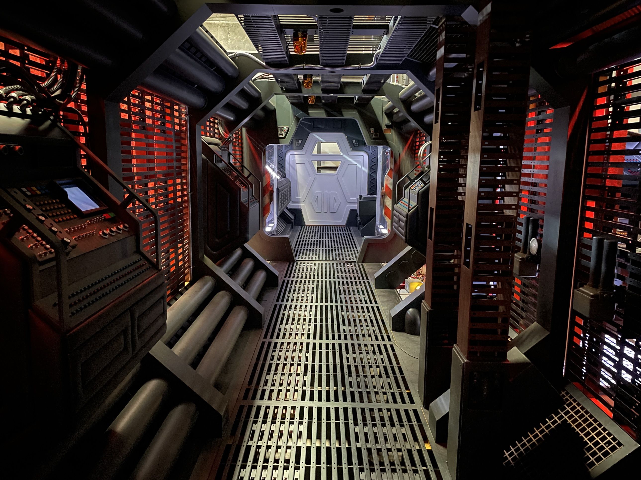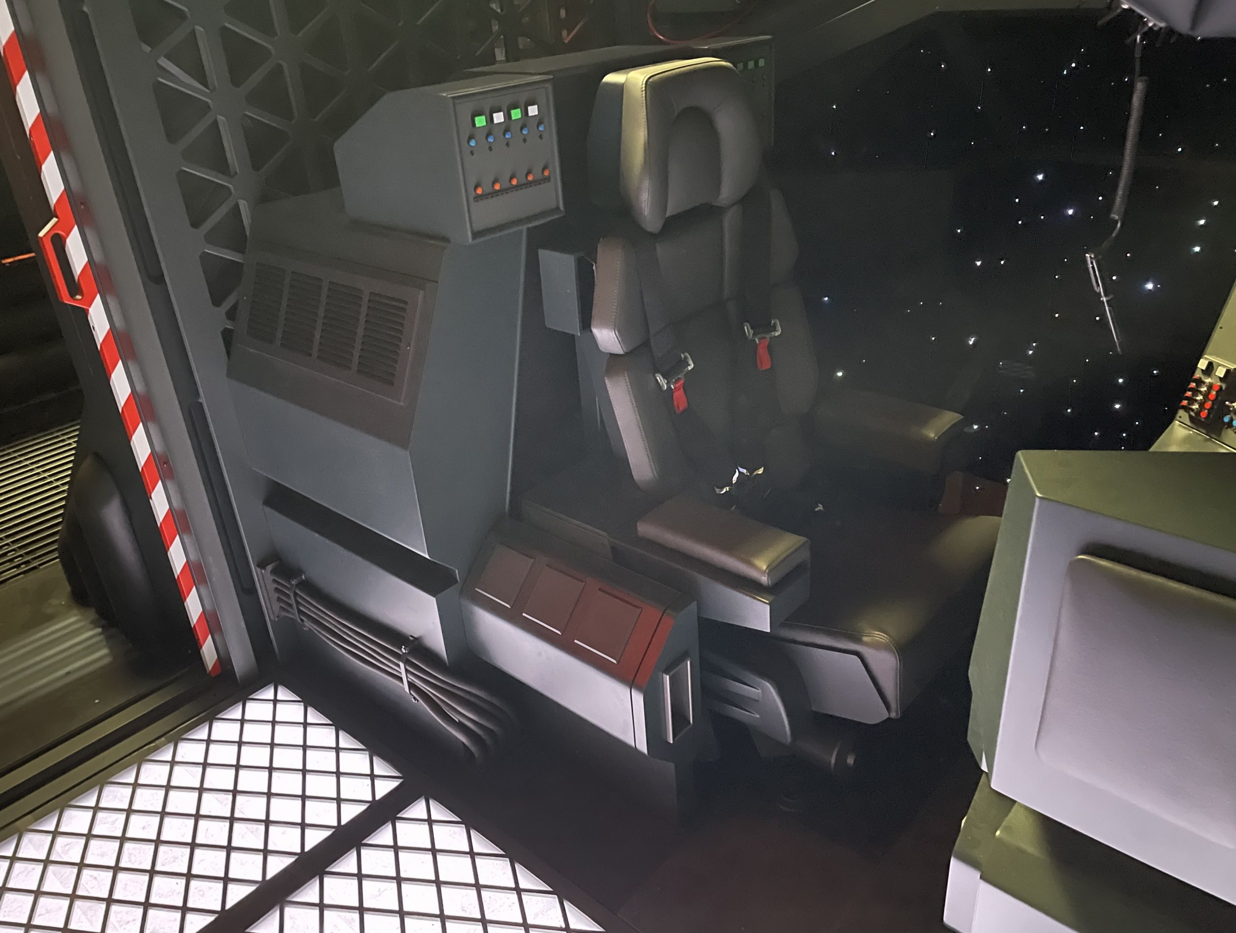 Another shot at the bridge window, but the reflection of the undergrate lighting behind me was more visible than it was in person. But this was the best photo I took of the flight console detail at the time, with what felt like the appropriate videos running on it.